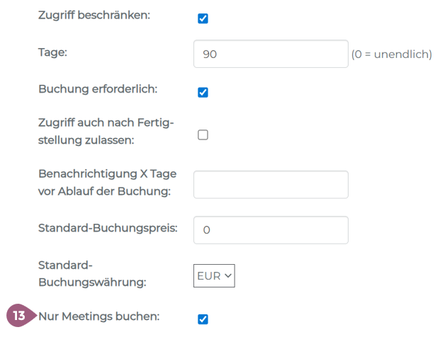 (13) Wenn „nur Meetings buchen“ unter “Zugriff beschränken” aktiviert ist, dürfen Benutzer nur einzelne Meetings innerhalb eines Seminars buchen. Jedes Meeting muss individuell gebucht werden. Wenn diese Einstellung deaktiviert ist, buchen die Lernenden das gesamte Seminar.