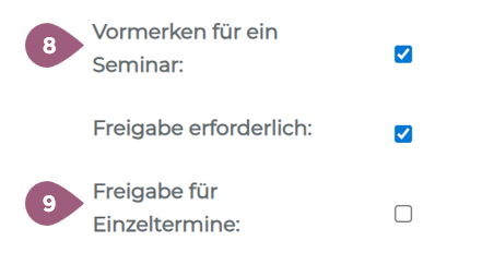 (8) Wenn “Vormerken für ein Seminar” aktiviert ist, können Benutzer sich für ein Seminar vormerken. Somit werden sie benachrichtigt, sobald ein neuer Termin erstellt wurde.