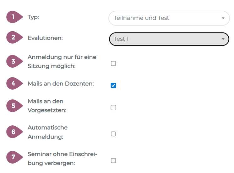 (1) Die Funktion des Typs beinhaltet Wahlmöglichkeiten zwischen „Teilnahme und Test” und „Teilnahme”. Damit definieren Sie, ob das Seminar mit einer aktiven Teilnahme und einem Test abgeschlossen werden kann oder ob eine präsente Teilnahme für den erfolgreichen Abschluss genügt. Damit das Seminar als bestanden verbucht werden kann, müssen Sie die Teilnehmer in der Teilnehmerverwaltung als „teilgenommen” und „bestanden” markieren. Nur, wenn beide Kriterien als bestanden markiert wurden, erhält der Teilnehmer sein Zertifikat. Mehr zum Typ finden Sie hier.