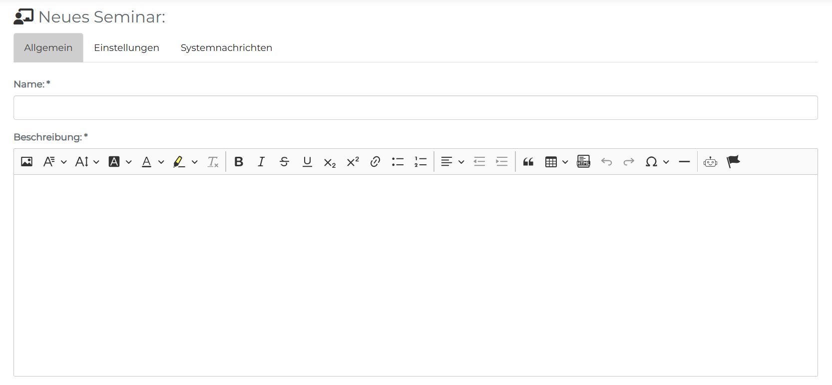 Seminare erstellen Sie unter Administration > Inhalt > Seminare durch Klick auf den Button „Neues Seminar“. Wenn ein neues Seminar erstellt wird, wird drei Reiter oben angezeigt: Allgemein, Einstellungen, und Systemnachrichten.