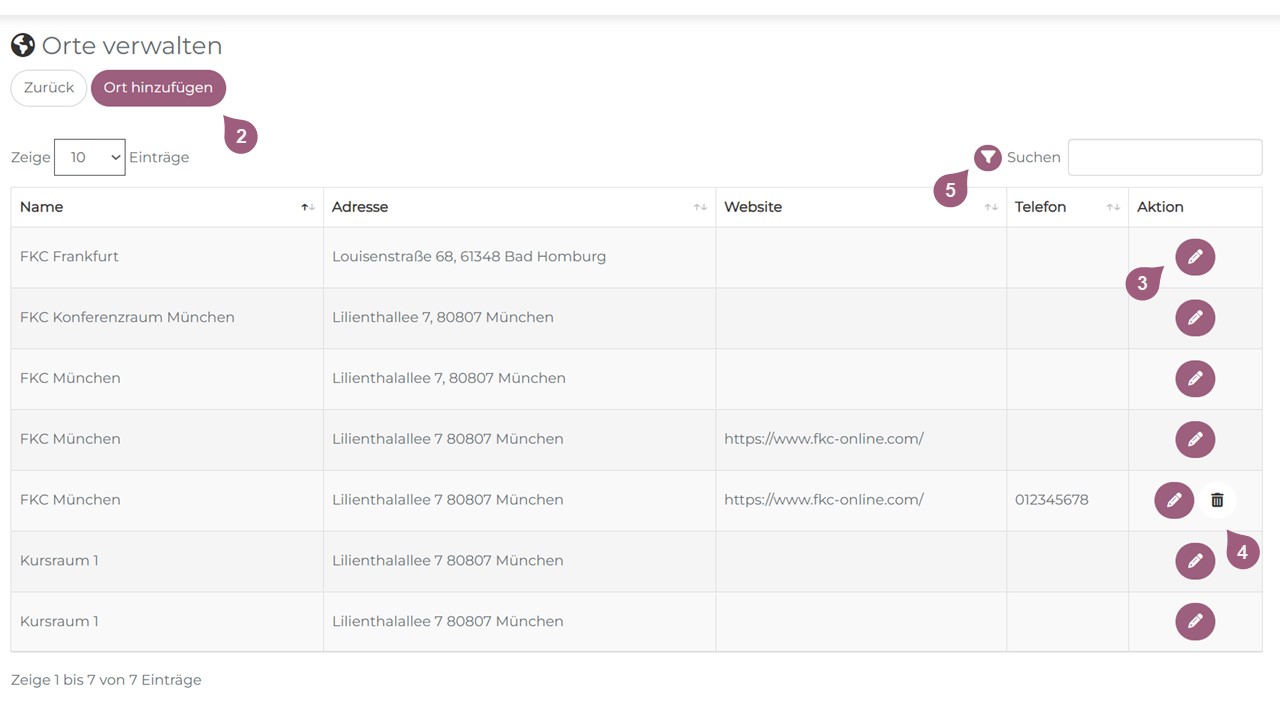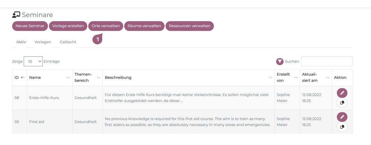 Mit Klick auf „Orte verwalten” (1) gelangen Sie auf die Übersicht der bereits erstellten Orte für Seminare. In dieser Übersicht besteht die Möglichkeit, einen neuen Ort hinzuzufügen (2) oder die bereits erstellten Orten zu editieren (3).
