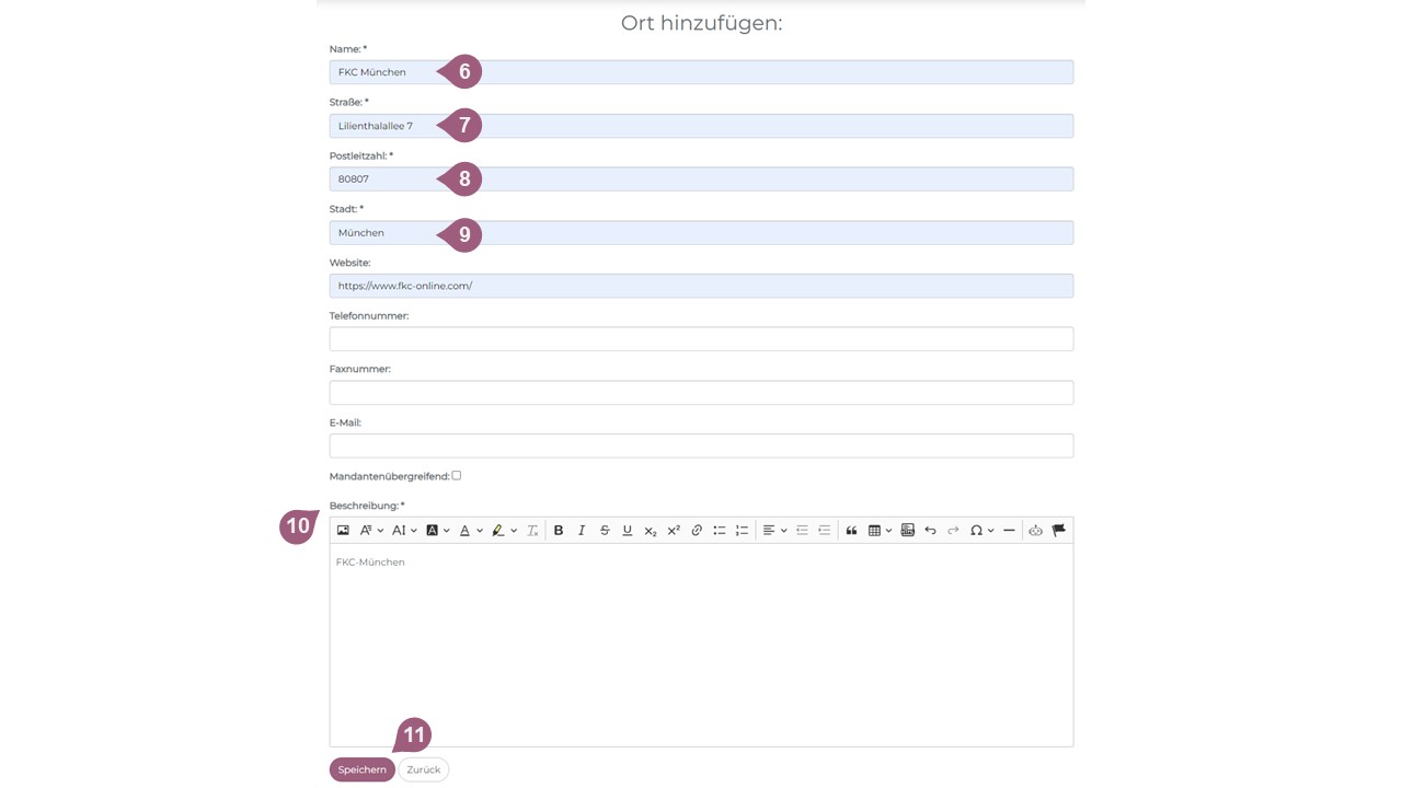 Wenn Sie einen neuen Ort hinzufügen (2) möchten, müssen Sie den Ortsnamen (6), die Straße mit Hausnummer (7), die Postleitzahl (8), die Stadt (9) und die Beschreibung (10) angeben. Das Angeben der restlichen Attribute, sowie die mandantenübergreifende Funktion sind optional.
