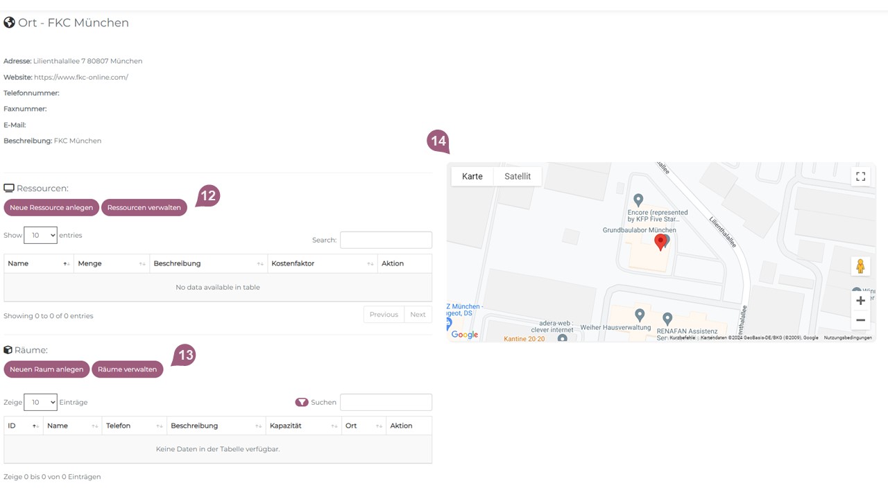Nachdem Sie den Ort erfolgreich gespeichert (11) haben, gelangen Sie auf die Übersicht des Orts und können diesem Ort eine Ressource (12) und einen Raum hinzufügen (13) und diese ebenfalls verwalten. Die Lage des Orts wird mithilfe einer Kartenansicht (14) dargestellt. Die Ressourcen und Räume, die erstellt und diesem Ort zugeordnet werden, können Sie aus den Tabellen entnehmen. Weitere Informationen erhalten Sie unter Ressourcen erstellen und Räume erstellen.