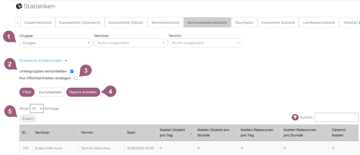Im Statistikbereich unter Administration > Benutzer > Statistiken > Planung/Übersicht stehen zwei Tabs in Bezug zu Seminaren zur Verfügung: „Seminarstatistik“ und „Seminarkostenstatistik”. Im Folgenden wird jeweils näher darauf eingegangen.