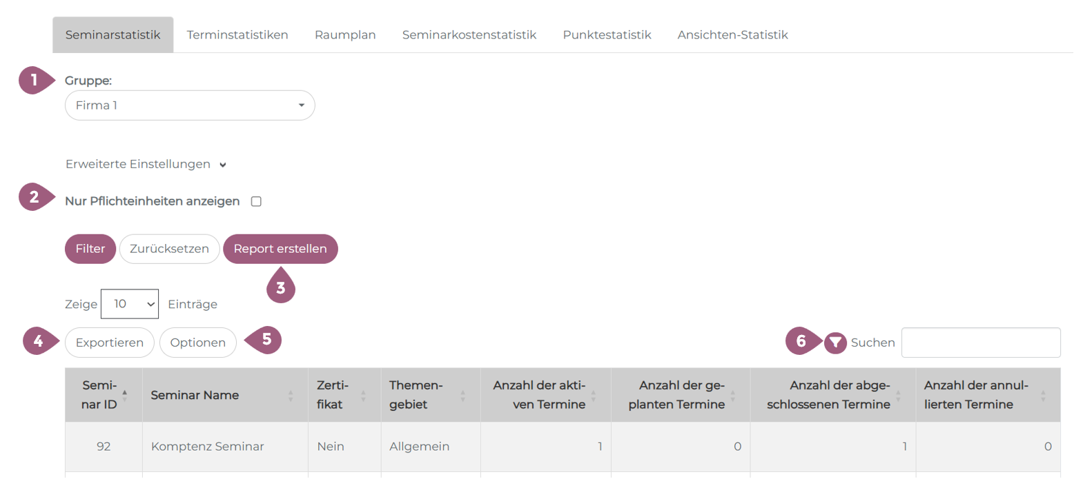 In der Seminarstatistik lassen sich Auswertungen zu Gruppen bei Seminaren erstellen. Es wird eine Übersicht über aktive, geplante, abgeschlossene und annullierte Termine angezeigt. Folgende Optionen stehen Ihnen dort zur Verfügung: