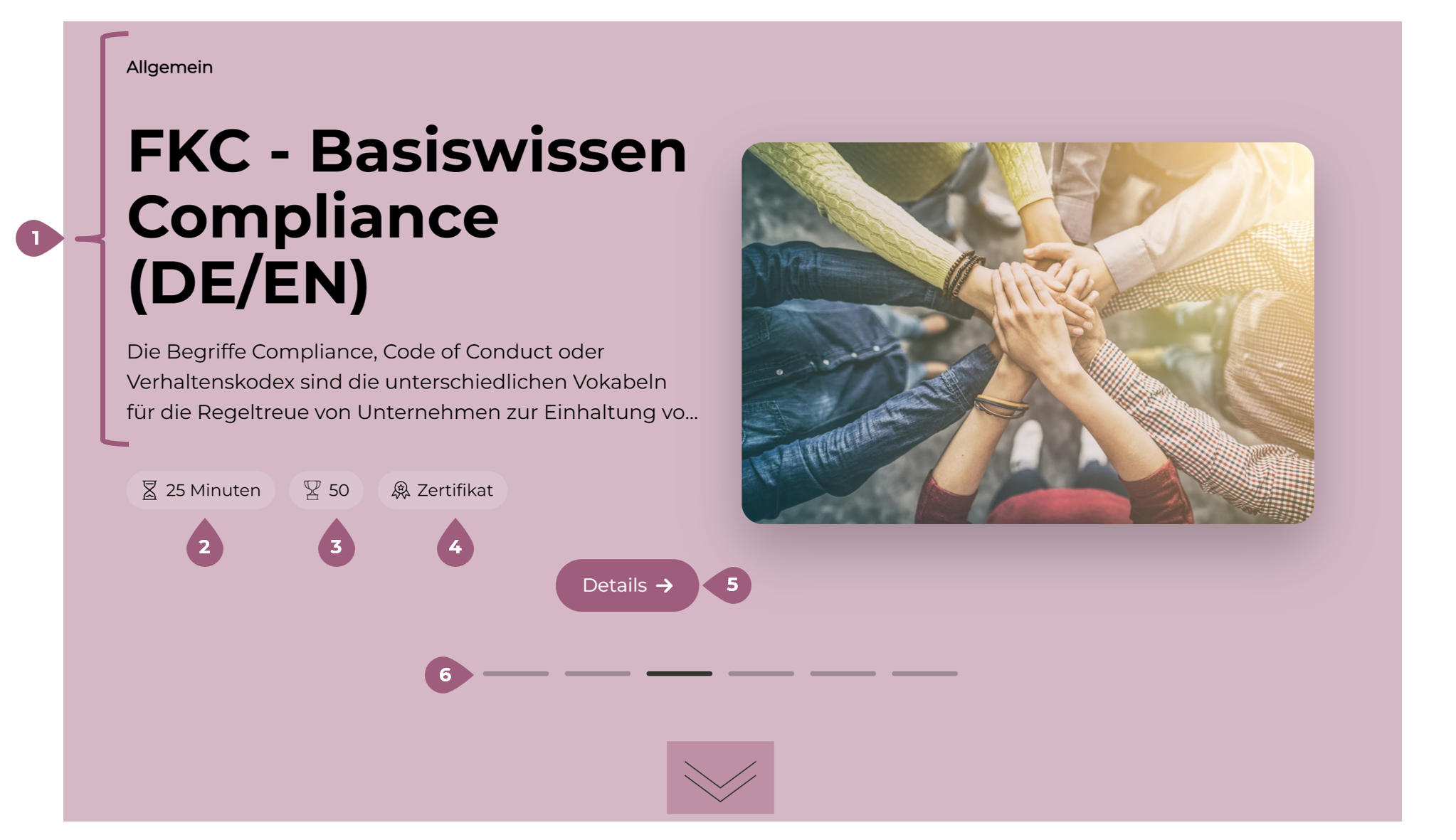 Bei Leneinheiten sehen Benutzer (1): das Themengebiet, den Titel, die Beschreibung sowie das Vorschaubild der Lerneinheit.