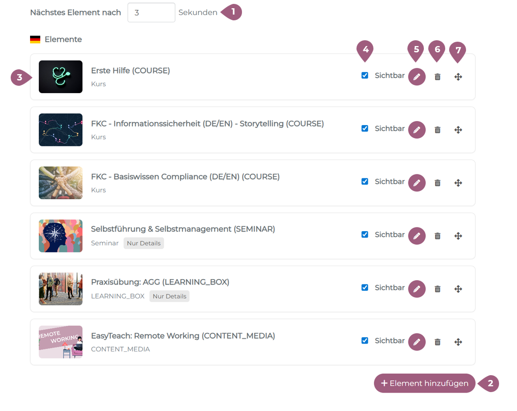 Die Sichtbarkeit der einzelnen Elemente kann ebenfalls angepasst werden (4). Ist ein Element nicht sichtbar, wird in der Lerneransicht keine Karte im Slider angezeigt. Über das Bleistift-Symbol können neue Lernelemente ausgewählt werden (5). Elemente lassen sich über das Mülleimer-Symbol löschen (6). Die Reihenfolge der Slider-Elemente kann über die Pfeil-Symbole angepasst werden (7).