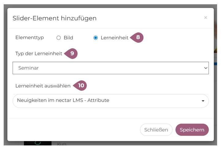 Wenn Sie neue Elemente hinzufügen möchten, können Sie zwischen Bildern und Lerneinheiten wählen (8). Bilder müssen zuvor in das LMS hochgeladen werden. Bei Lerneinheiten muss zunächst der Typ (9) und anschließend die entsprechende Lerneinheit ausgewählt werden (10). Mögliche Lerneinheitstypen im Slider sind: Kurse, Kursreihen, Lernboxen, Medien und Seminare.