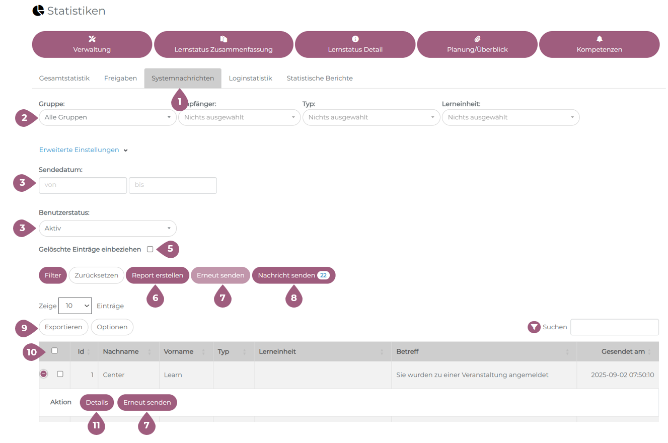 (2) Filter nach Gruppen, Empfänger, Typ, und Lerneinheit