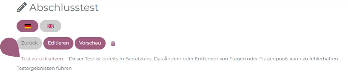 Um einen gestarteten Test zurückzusetzen, klicken Sie unter Administration > Tests auf das Editiersymbol rechts neben dem gewünschten Test. Anschließend wählen Sie “Test zurücksetzen”, um alle Fortschritte, die für diesen Test vorliegen, auf Null zu setzen.