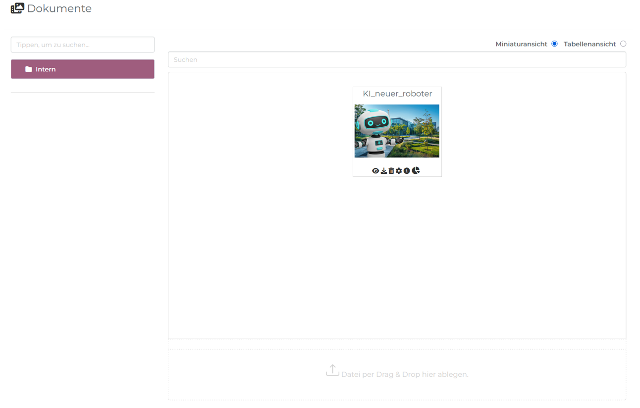 Unter Mediapool können Sie neue Bilder, PDFs oder weitere Dokumente zur internen Nutzung hochladen. Dateien von anderen werden nicht angezeigt.