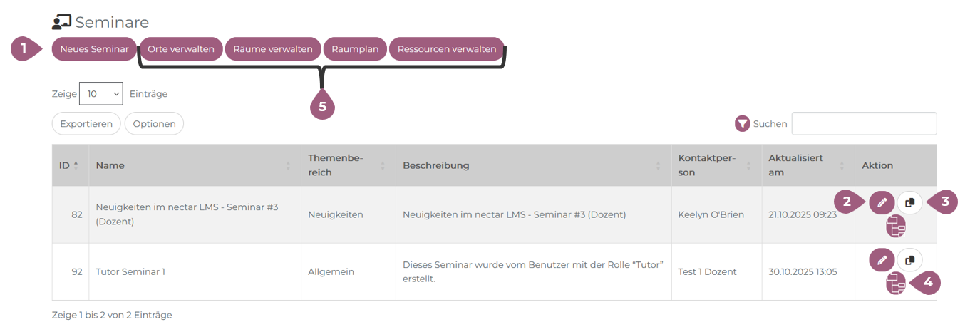 Bei Seminaren haben Sie zudem die Möglichkeit, Orte, Räume und Ressourcen für Seminare zu erstellen (5). Nur Orte, Räume und Ressourcen, die von Ihnen erstellt wurden, können von Ihnen eingesehen und bearbeitet werden. Bereits vorhandene können Sie in Seminaren nutzen, jedoch nicht in der Übersichtstabelle einsehen oder verwalten. Unter dem Raumplan sehen Sie die Raumbuchungen.