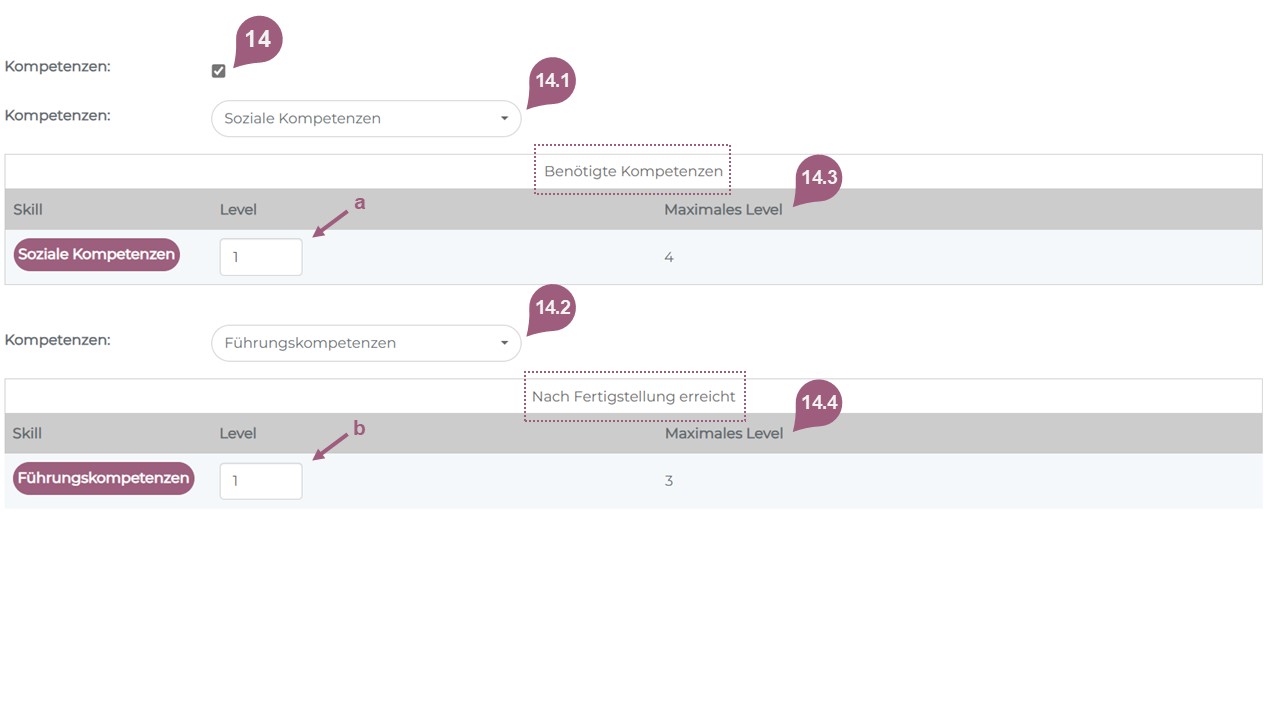 (14) Über diese Checkbox wählen Sie die Kompetenzen aus, die die Lernenden als Voraussetzung zum Teilnehmen eines Mediums benötigen sowie die Kompetenzen, welche die Lernenden nach erfolgreicher Fertigstellung des Mediums erhalten. Die vorausgesetzten Kompetenzen (14.1) und die erworbenen Kompetenzen (14.2) können Sie mit Hilfe des Dropdown-Menüs auswählen. Sie haben die Möglichkeit, ein Level anzugeben, welches erreicht sein muss (a) bevor teilgenommen werden kann bzw. (b) welches erreicht wird nachdem teilgenommen wurde. Das maximale Level dabei zeigt an, wie viele Level erreicht sein müssen (14.3) bzw. erreicht werden können (14.4). Kompetenzen können Sie über Administration > Einstellungen > Kompetenzen hinterlegen. Wenn Sie einzelne Kompetenzen entfernen möchten, können Sie diese über das Dropdown-Menü abwählen. Wenn Sie alle Kompetenzen deaktivieren möchten, entfernen Sie das Häkchen für Kompetenzen und speichern den Vorgang ab.