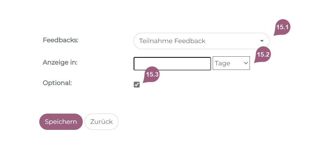 (15) Feedbacks können über Administration > Inhalt > Feedbacks erstellt und zum Ende des Mediums eingebunden werden. Das Feedback, welches Sie einbinden möchten, können Sie über das Dropdown-Menü auswählen (15.1). Sie können in Stunden oder Tagen angeben, wann das Feedback angezeigt werden soll (15.2). Der Fragebogen wird dann je nach angegebener Zeit automatisch vom System freigeschaltet. Folgend können Sie angeben, ob das Ausfüllen des Fragebogens optional oder verpflichten absolviert werden muss (15.3), um das Medium als abgeschlossen werten zu können.