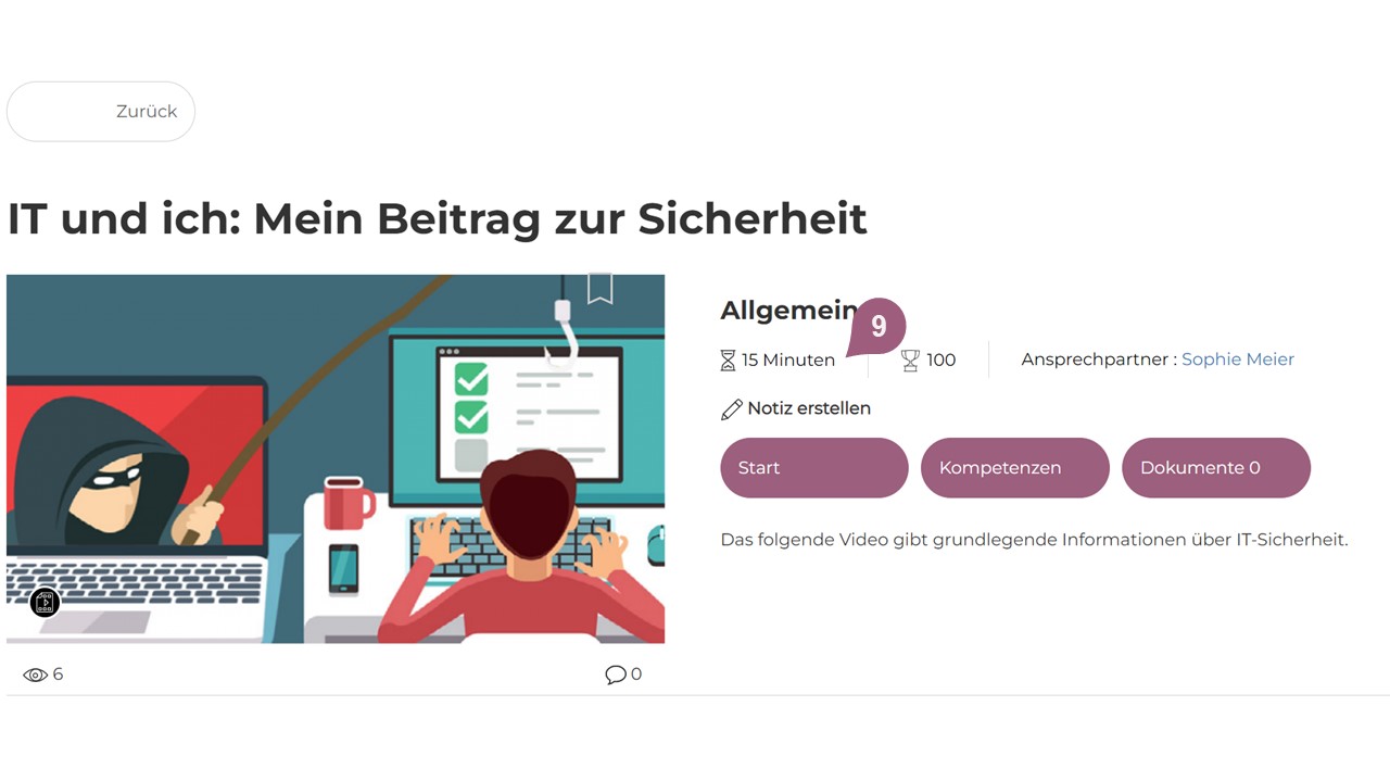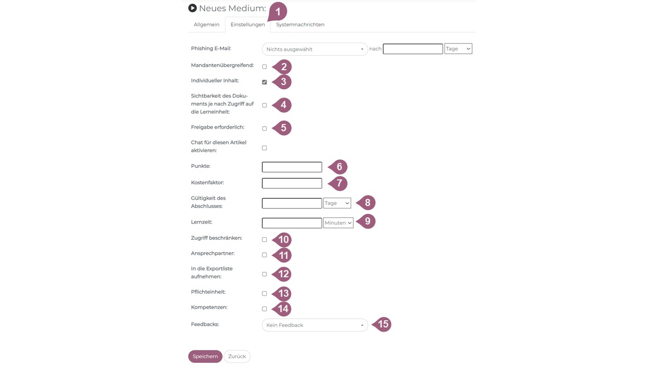 (9) Die hier eingestellte Lernzeit (in Minuten) wird den Lernenden in der Detailansicht des jeweiligen Mediums angezeigt und dient als Richtwert, wie lange die Bearbeitung des Mediums voraussichtlich dauert.