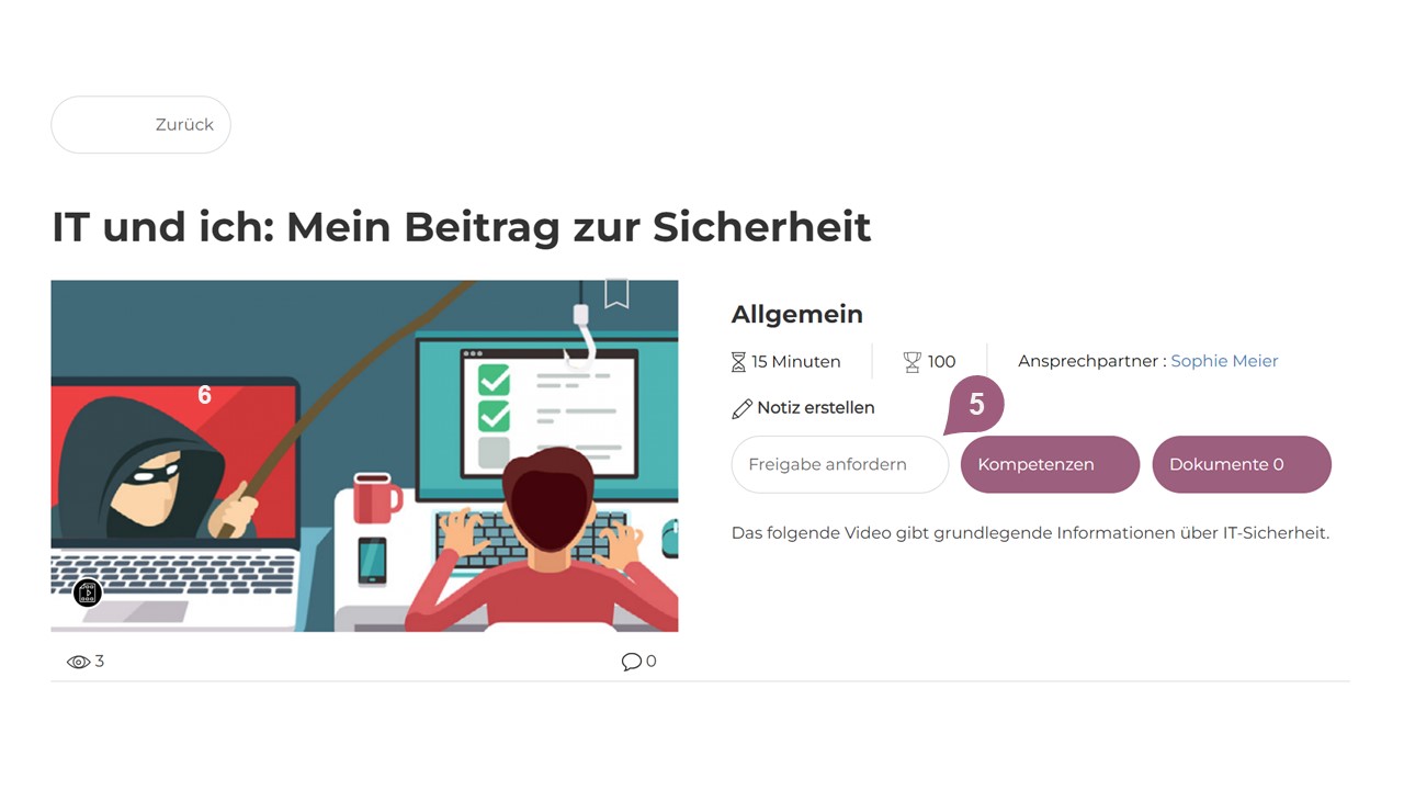 (5) Wenn für ein Medium die Option „Freigabe erforderlich“ aktiviert wird, muss die Freischaltung für dieses Medium zuerst vom Vorgesetzten erteilt werden, bevor der Lerner dieses beginnen kann. Anstelle des „Starten“-Buttons sieht der Lerner im Kursüberblick in diesem Fall das Feld „Freigabe anfordern“, über welches er bei seiner im LMS hinterlegte Führungskraft die Freigabe beantragen kann. Die Führungskraft erhält daraufhin eine Benachrichtigung (im LMS sowie je nach Konfiguration auch per E-Mail). Der Lerner wird unmittelbar nach der Entscheidung seines Vorgesetzten per Nachricht darüber informiert und kann nach erteilter Freigabe direkt beginnen, das Medium zu absolvieren.