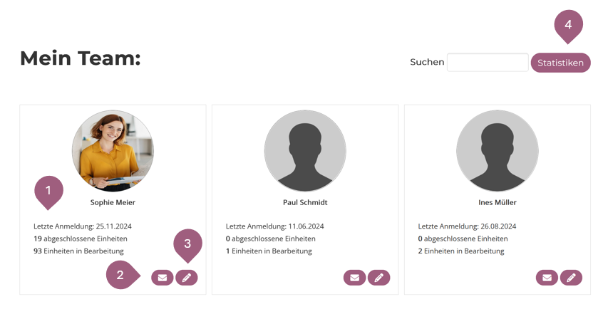 Vorgesetzte haben keinen Zugriff auf den Administrationsbereich, es kann jedoch das Vorgesetzten-Dashboard „Mein Team“ aktiviert werden. Die Vorgesetzten können hier sehen, wann sich ihre Teammitglieder zuletzt eingeloggt haben (1), wie viele Lerneinheiten aktuell in Bearbeitung und bereits abgeschlossen sind (1), sie können ihren Teammitgliedern Nachrichten senden (2) sowie auf deren Profil zugreifen (3). Zudem haben die Vorgesetzen Zugriff auf die Statistik, in der sie die Lernfortschritte, eingeschränkt auf ihr Team, einsehen können (4).