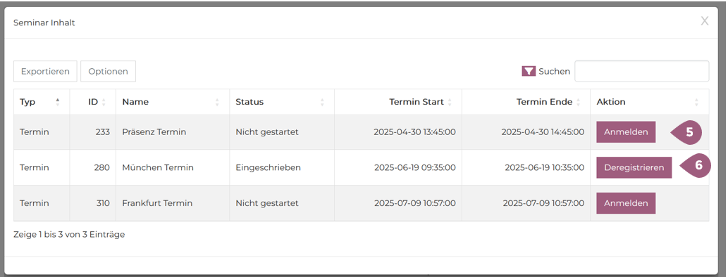 Im Rahmen der Benutzerverwaltung können Vorgesetzte ihre Teammitglieder zu Seminaren an- und abmelden. Mit einem Klick auf das Bildschirmsymbol in der Registerkarte „Lerneinheiten“ sehen Vorgesetzte die offenen Termine des Seminars. Dort können sie Benutzer anmelden (5) oder de-registrieren (6).