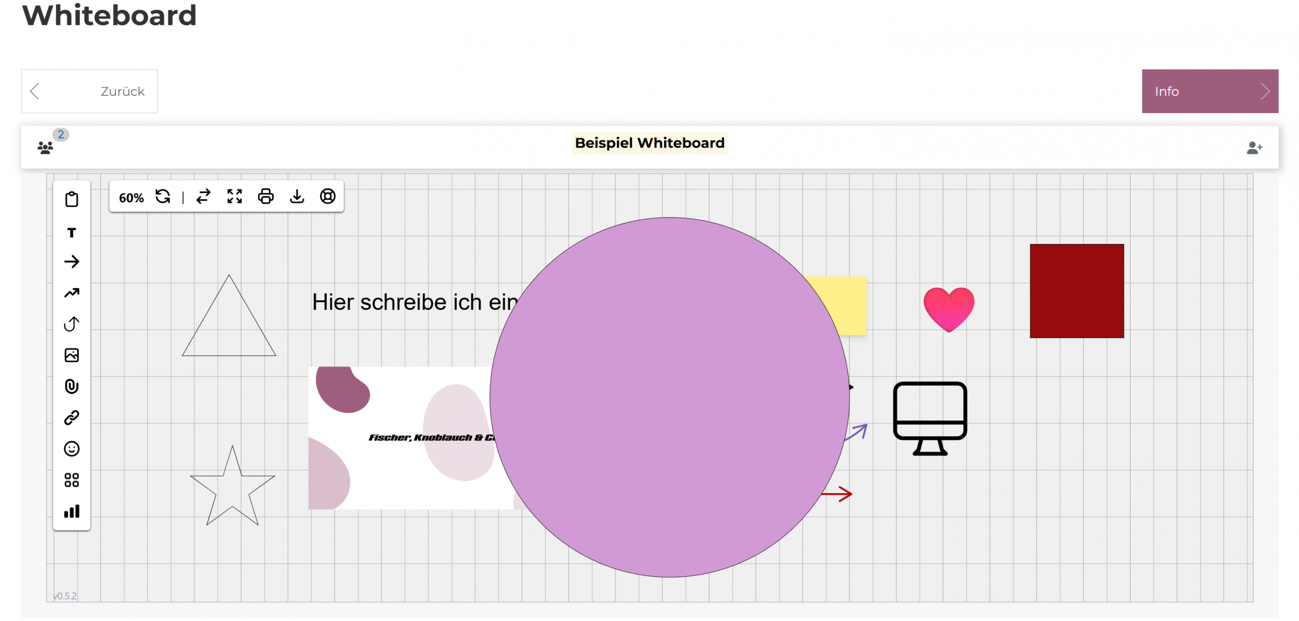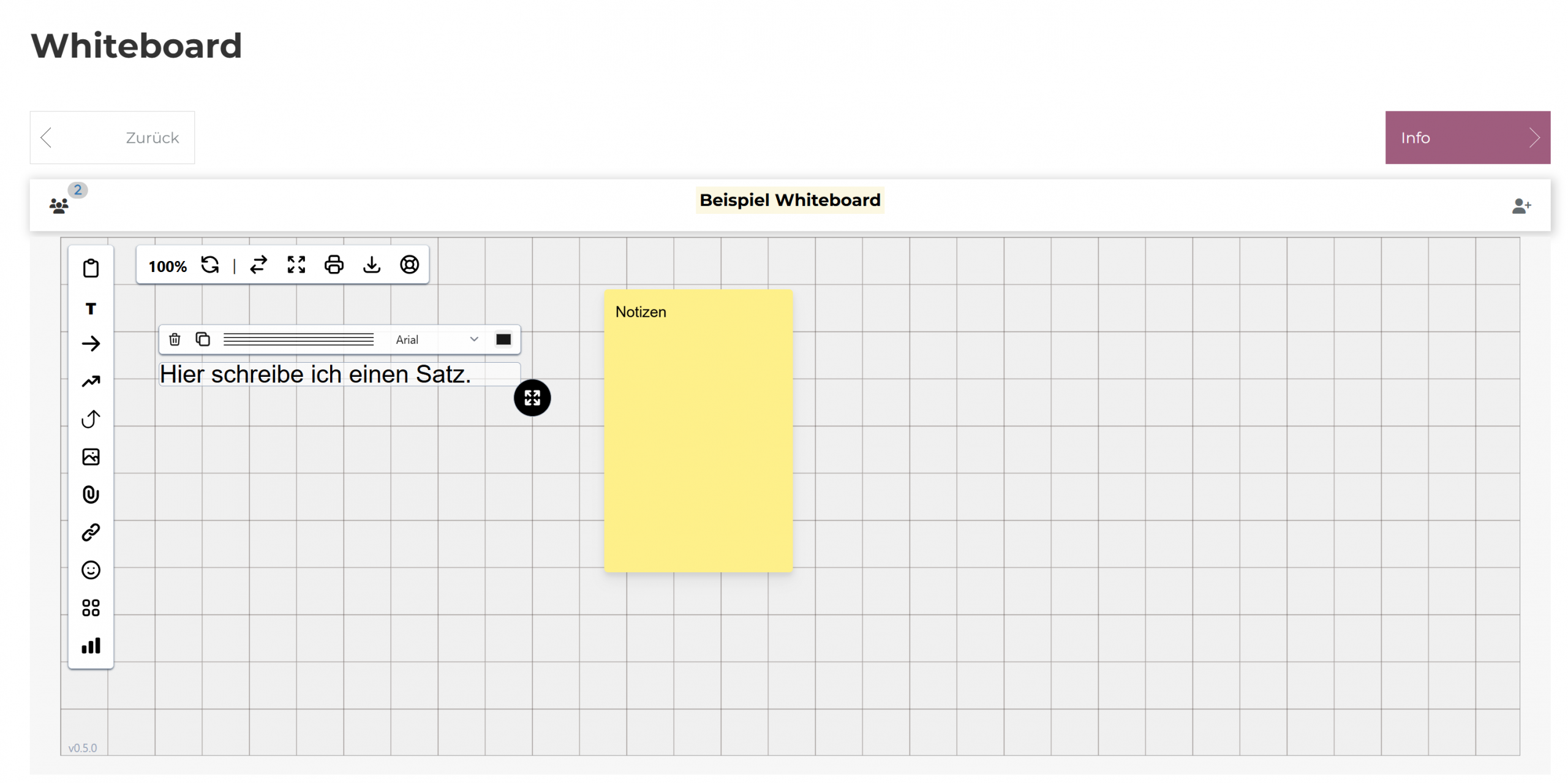 (21) Drucken: Über den Button können Sie das Whiteboard drucken. Bitte beachten Sie, dass dabei ein Screenshot der aktuellen Ansicht erstellt wird – wenn Sie hineingezoomt haben und nicht alle Elemente sichtbar sind, werden diese auch nicht gedruckt.