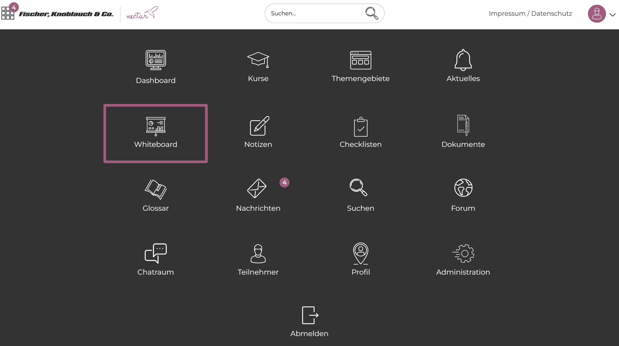 Wenn Sie das Whiteboard in Ihrem LMS freigeschaltet haben, sehen Sie unter Administration die entsprechende Menü-Kategorie für das Whiteboard. Klicken Sie darauf, um Ihre Whiteboards zu sehen oder ein neues zu erstellen: