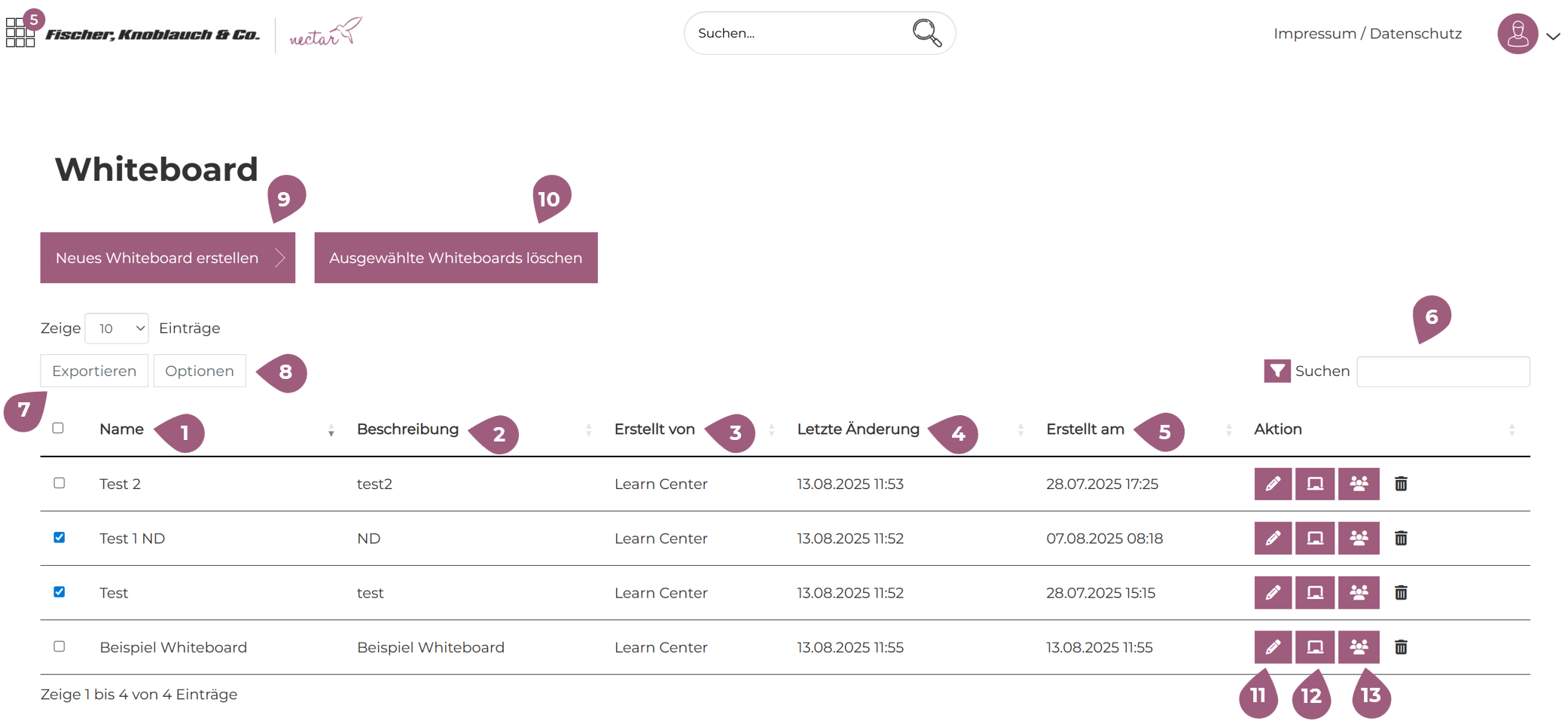 Die Whiteboard-Übersicht ähnelt sich der Kurs-Übersicht. Sie sehen die bereits erstellten Whiteboards mit folgenden Informationen: