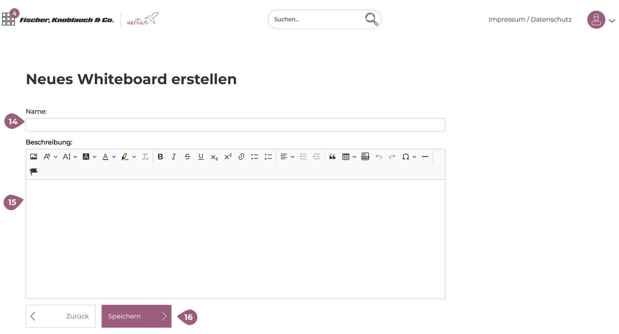 Ein neues Whiteboard zu erstellen, müssen Sie den Name (14) und die Beschreibung (15) ausfüllen und anschließend auf “Speichern” (16): klicken: